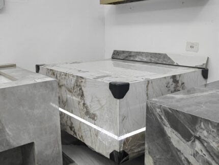 مغسلة دولاب رخام ابيض مع اضاءة موديل العمودي